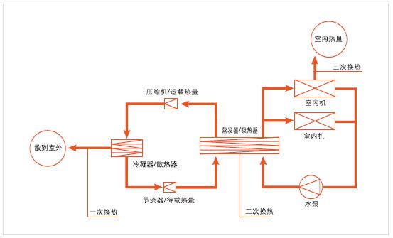 室外機(jī)一般稱為冷熱水機(jī)組,室內(nèi)機(jī)一般稱為風(fēng)機(jī)盤管,通過(guò)水管連接。室外機(jī)組產(chǎn)生冷/熱水,用水泵送入每個(gè)室內(nèi)機(jī),室內(nèi)空氣與水換熱達(dá)到溫度調(diào)節(jié)的目的。