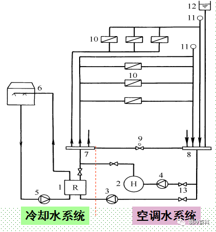 1-水冷冷水機組 ;2-鍋爐 ;3-冷凍水泵 ;4-熱水泵 ;5-冷卻水泵 ;6-冷卻塔 ;7-分水器;8-集水器 ;9-壓差控制閥 ;10-空調(diào)設(shè)備 ;11-自動排氣閥 ;12-膨脹水箱 ;13-閥門