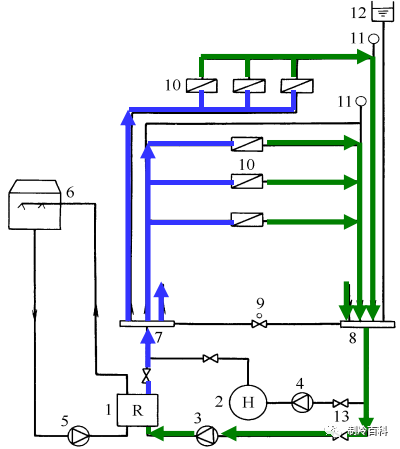 夏季供冷時 :下圖所示,冷水機組1制出的7℃冷凍水,在冷凍水泵3的作用下送至分水器7,然后由分水器通過各供水支管分別送至各空調(diào)房間或區(qū)域的空調(diào)設(shè)備10